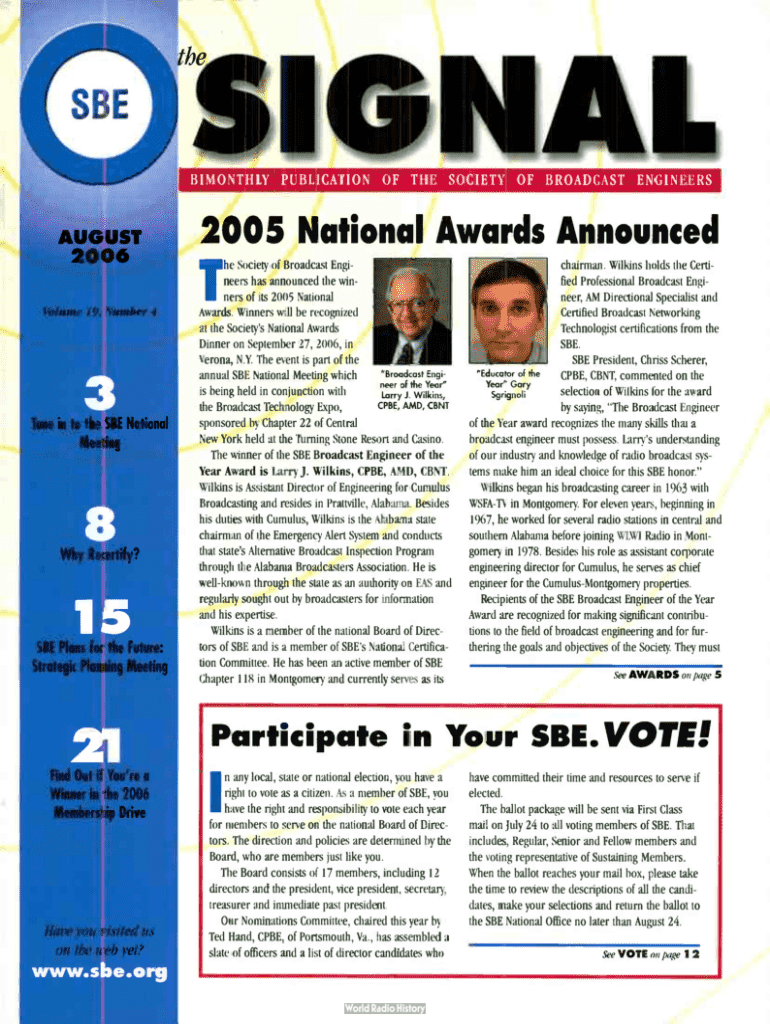 hseBIMONTHLYAUGUST 2006 Volume 1\'9, .VumberTune in to the. SBE Nation MeetingWhy IRKertifySBE Plans for the Futur Strategic Planning MeetiGAUBLICATIONOFTHESOCIETYOFBROADCASTENGINEERS2005 National Awards AnnouncedThe Society of Broadcast Engineers has announced the winners of its 2005 National Awards. Winners will be recognized at the Society\'s National Awards Dinner on September 27, 2006, in Verona, N.Y. The event is part of the annual SBE National Meeting which is