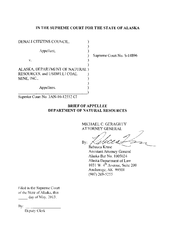 IN THE SUPREME COURT FOR THE STATE OF ALASKADENALI CITIZENS COUNCIL,) ) ) )Appellant,v.Supreme Court No. S14896)) ALASKA, DEPARTMENT OF NATURAL) RESOURCES, and USIBELLI COAL ) MINE, INC., ) ) Appellees. )___) Superior Court No. 3AN1012552 CIBRIEF OF APPELLEE DEPARTMENT OF NATURAL RESOURCESMICHAEL C. GERAGHTY ATTORNEY GENERALBy:;ZRebecca Kruse Assistant Attorney General Alaska Bar No. 1005024 Alaska Department of Law 1031 W. 4th Avenue, Suite 200 Anchorage, AK 99501 (907)