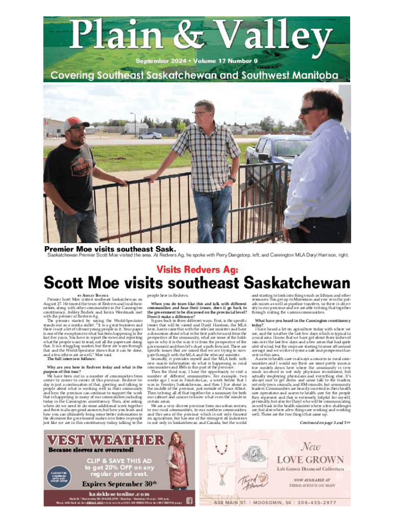 ls OutSale!September 2024 Volume 17 Number 9Premier Moe visits southeast Sask. Saskatchewan Premier Scott Moe visited the area. At Redvers Ag, he spoke with Perry Dangstorp, left, and Cannington MLA Daryl Harrison, right.Visits Redvers Ag:Scott Moe visits southeast Saskatchewan BY ASHLEY BOCHEK Premier Scott Moe visited southeast Saskatchewan on August 27. He toured the town of Redvers and local businesses, along with other communities in the Cannington constituency. Ashley Bochek
