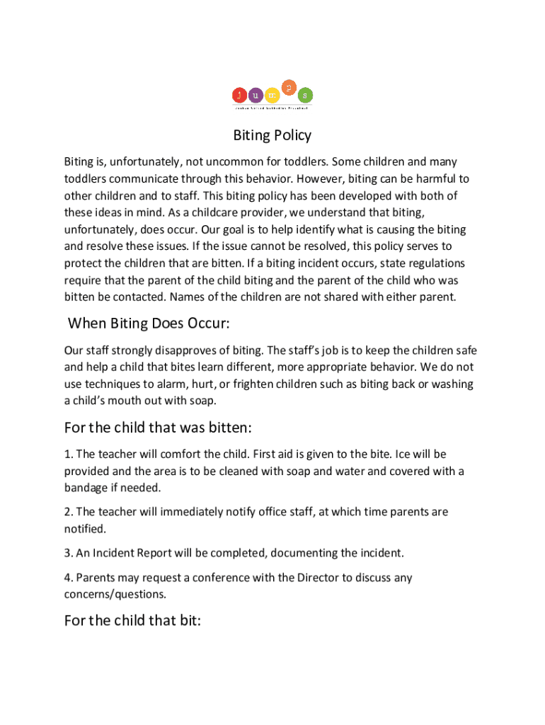 Biting Policy Biting is, unfortunately, not uncommon for toddlers. Some children and many toddlers communicate through this behavior. However, biting can be harmful to other children and to staff.