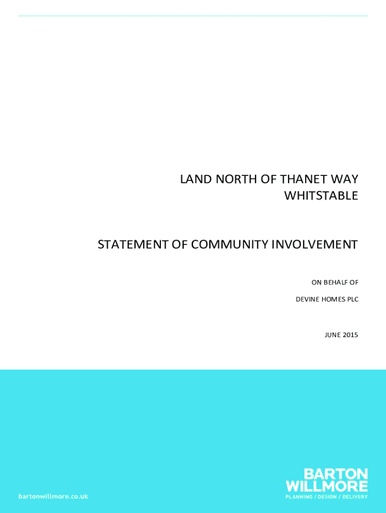 LAND NORTH OF THANET WAY WHITSTABLESTATEMENT OF COMMUNITY INVOLVEMENT ON BEHALF OF DEVINE HOMES PLCJUNE 2015STATEMENT OF COMMUNITY INVOLVEMENT LAND NORTH OF THANET WAY, WHISTABLE ON BEHALF OF DEVINE HOMES PLC JUNE 2015Project Ref: Status: Issue/Rev: Date: Prepared By: Checked By: Approved By:23907/A5 Final 01 11/06/2015 P Storey J Finn S FlisherBarton Willmore LLP The Observatory Southfleet Road Ebbsfleet Dartford DA10 0DF Tel: Fax: Email:(01322) 374660 (01322) 374661 james.finn@bartonwillmore