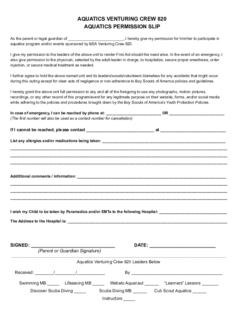 AQUATICS VENTURING CREW 820 AQUATICS PERMISSION SLIP As the parent or legal guardian of ___, I hereby give my permission for him/her to participate in aquatics program and/or events sponsored by BSA
