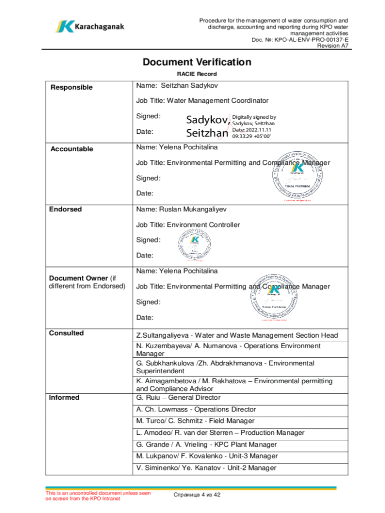 Document owner:Environmental Permitting and Compliance ManagerProcedure for management of water TITLE: consumption and discharge, accounting and reporting during KPO water management activities DOCUMENT No: KPOALENVPRO00137EThis is an uncontrolled copy unless it is being viewed on screen from the KPO Intranet.A7Issued for review07/11/2022S. Sadykov/ Water Management CoordinatorRevPurposeDateResponsibleYe. Pochitalina/ Environmental Permitting and Compliance ManagerR