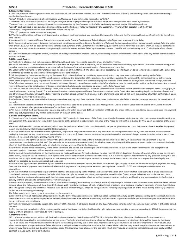 M723P.T.C. S.R.L. General Conditions of Sale1. General Provisions. 1.1 For the purposes of these general terms and conditions of sale (hereinafter referred to as the \" General Conditions of Sale\"),