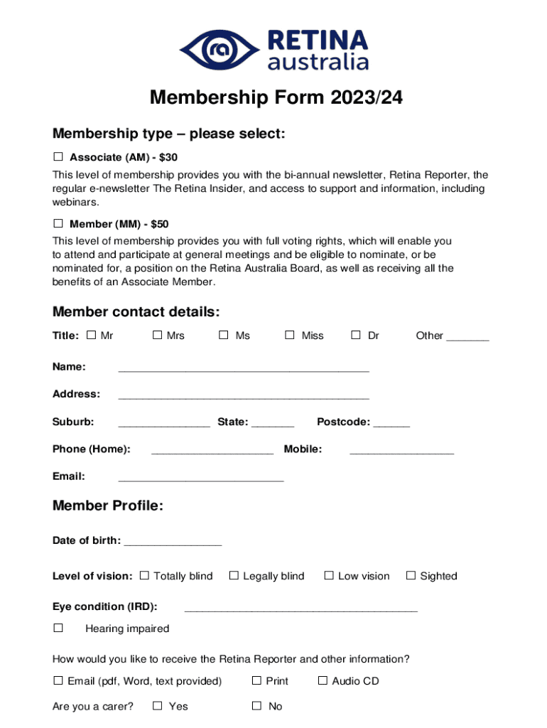 Join Retina Australia in 2023-2024 to receive newsletters, voting rights, and support for vision-related issues. Choose your membership level today!