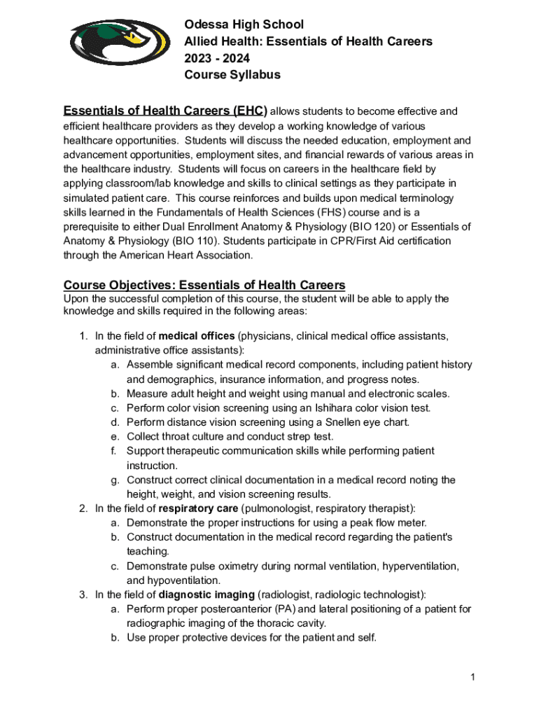 Odessa High School Allied Health: Essentials of Health Careers 2023 2024 Course Syllabus Essentials of Health Careers (EHC) allows students to become effective and efficient healthcare providers as