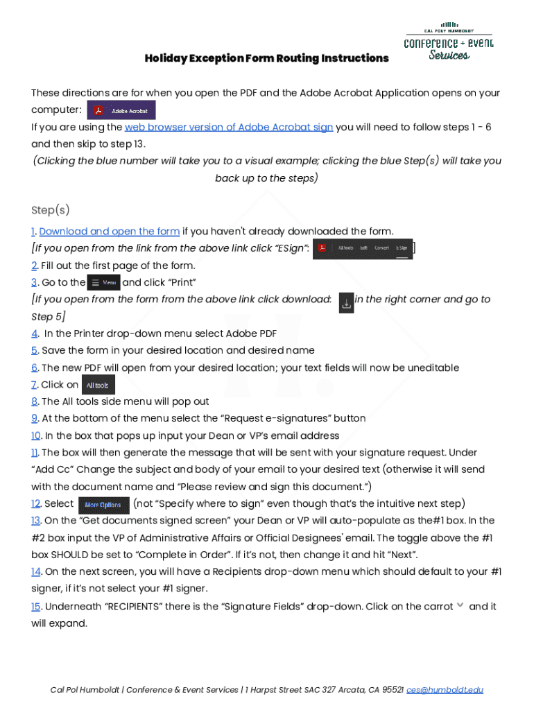 Detailed instructions for routing the Holiday Exception Form using Adobe Acrobat, ensuring proper e-signature and submission processes in 2023.