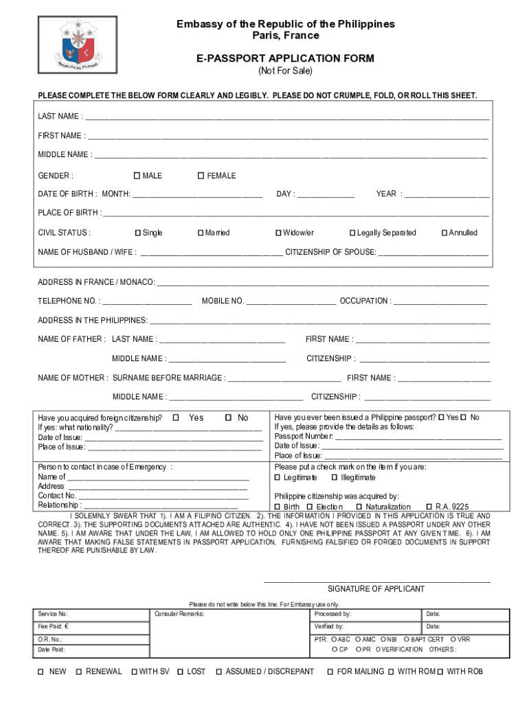 Complete this E-Passport Application Form for the Philippine Embassy in France. Ensure all details are accurate for efficient processing.