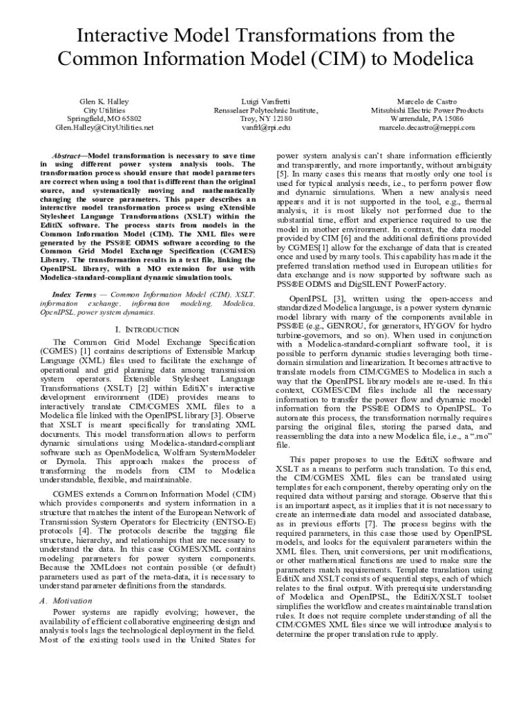 Interactive Model Transformations from the Common Information Model (CIM) to Modelica Glen K. Halley City Utilities Springfield, MO 65802 Glen.Halley@CityUtilities.netLuigi Vanfretti Rensselaer Polytechnic