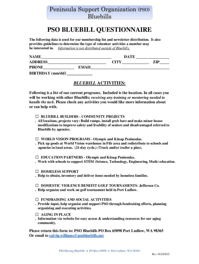 Pso Bluebill Questionnaire is not the form you're looking for?Search for another form here.