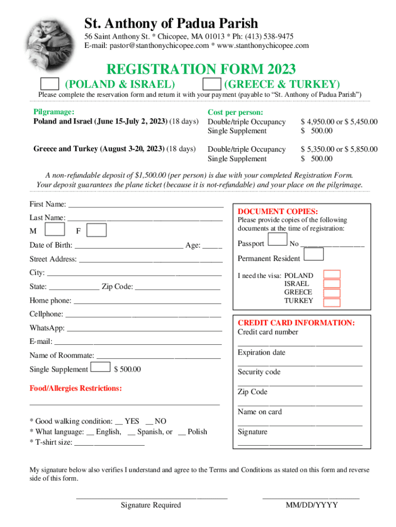 Complete your registration for the 2023 pilgrimage to Poland, Israel, Greece, and Turkey. Join us for an unforgettable journey with St. Anthony of Padua Parish.