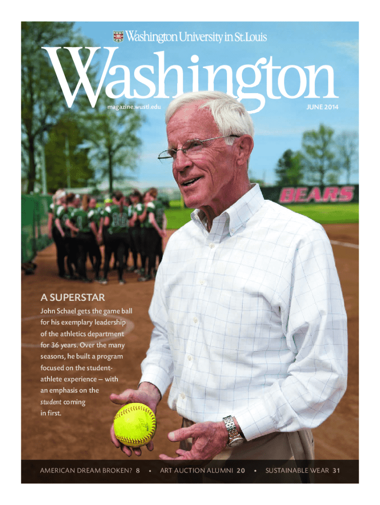 JUNE 2014magazine.wustl.eduA SUPERSTAR John Schael gets the game ball for his exemplary leadership of the athletics department for 36 years. Over the many seasons, he built a program focused on the studentathlete experience with an emphasis on the student coming in first.AMERICAN DREAM BROKEN? 8 JUN2014_ C.indd 1ART AUCTION ALUMNI 20SUSTAINABLE WEAR 31 9/3/14 5:09 PMFEATURES8IS THE AMERICAN DREAM BROKEN?14A MAN FOR ALL SEASONS20ARTFUL ENDEAVORSON THE COVER:At