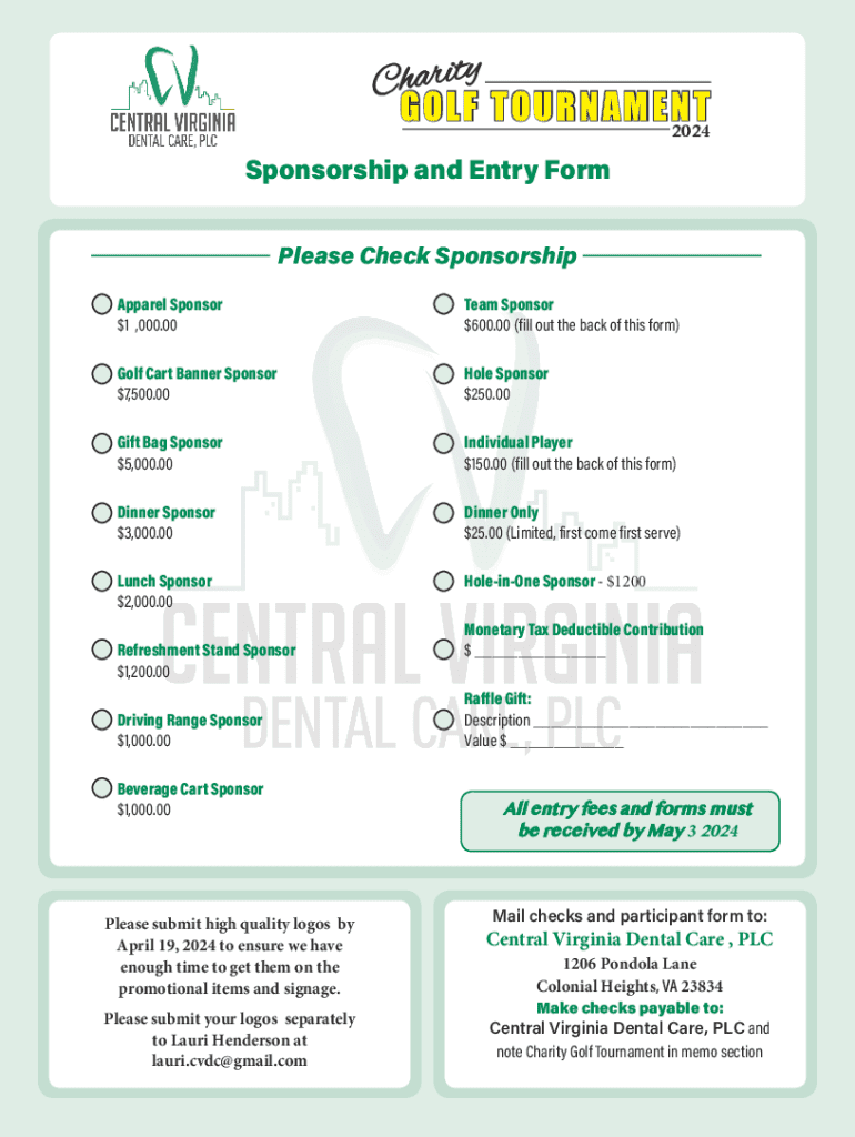 Participate in the 2024 Charity Golf Tournament with various sponsorship options and entry fees. Submit forms by May 3rd to support a noble cause.