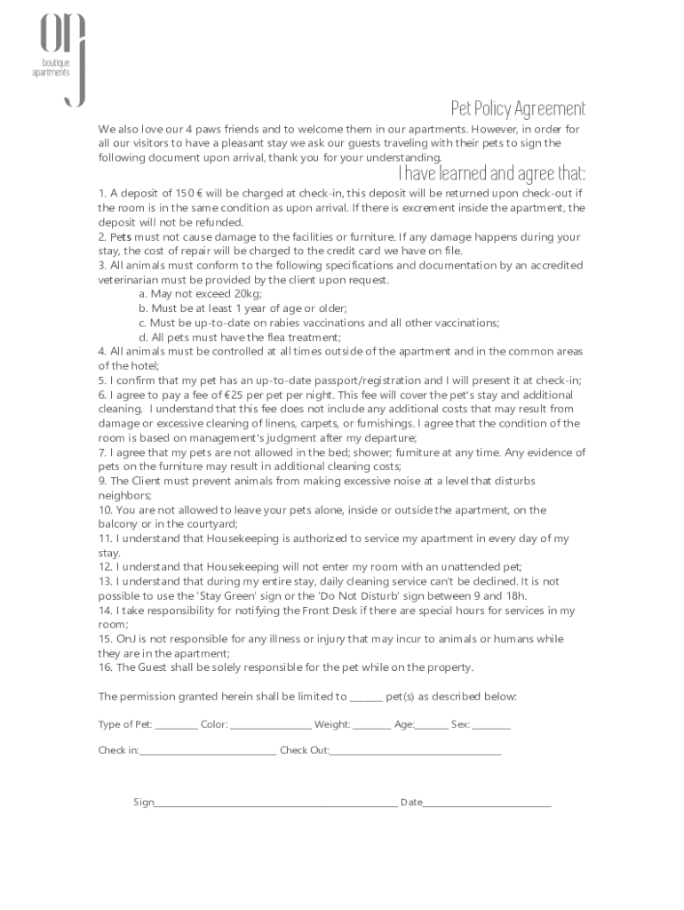 Pet Policy AgreementWe also love our 4 paws friends and to welcome them in our apartments. However, in order for all our visitors to have a pleasant stay we ask our guests traveling with their pets