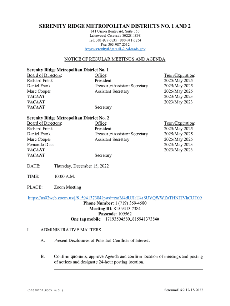 SERENITY RIDGE METROPOLITAN DISTRICTS NO. 1 AND 2 141 Union Boulevard, Suite 150 Lakewood, Colorado 802281898 Tel: 3039870835 8007413254 Fax: 3039872032 https://serenityridgemd12.colorado.gov NOTICE OF REGULAR MEETINGS AND AGENDA Serenity Ridge Metropolitan District No. 1 Board of Directors: Office: Richard Frank President Daniel Frank Treasurer/Assistant Secretary Marc Cooper Assistant Secretary VACANT VACANT VACANT SecretaryTerm/Expiration: 2025/May 2025 2025/May 2025 2025/May 2025 2023/May