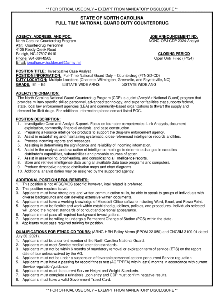 ** FOR OFFICAL USE ONLY EXEMPT FROM MANDATORY DISCLOSURE **STATE OF NORTH CAROLINA FULL TIME NATIONAL GUARD DUTY COUNTERDRUG AGENCY, ADDRESS, AND POC: North Carolina Counterdrug Program Attn: Counterdrug