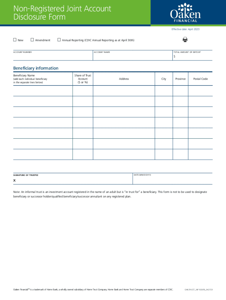 Discover the Non-Registered Joint Account Disclosure Form (April 2023) with essential details for beneficiaries, trustee signature, and account information.