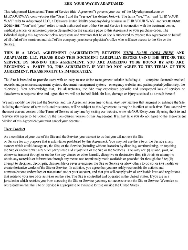 EHR YOUR WAY BY ADAPTED This Adapted License and Terms of Service (this Agreement) governs your use of the MyAdaptamed.com or EHRYOURWAY.com websites (the Sites) and the Service (as defined below).