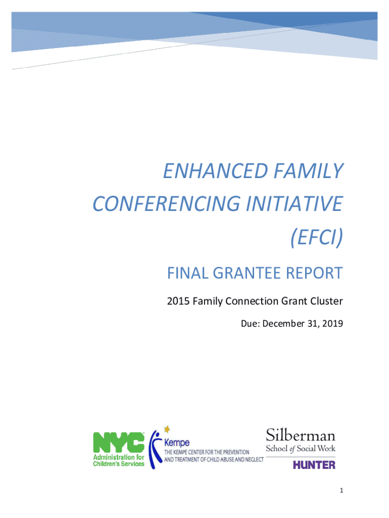 This report details the Enhanced Family Conferencing Initiative (FCI), a program aimed at improving child safety and family involvement in Bronx Zone E, NYC, funded by a $2 million grant. The evaluation covers implementation, outcomes, and recommendations for better outcomes in child welfare.