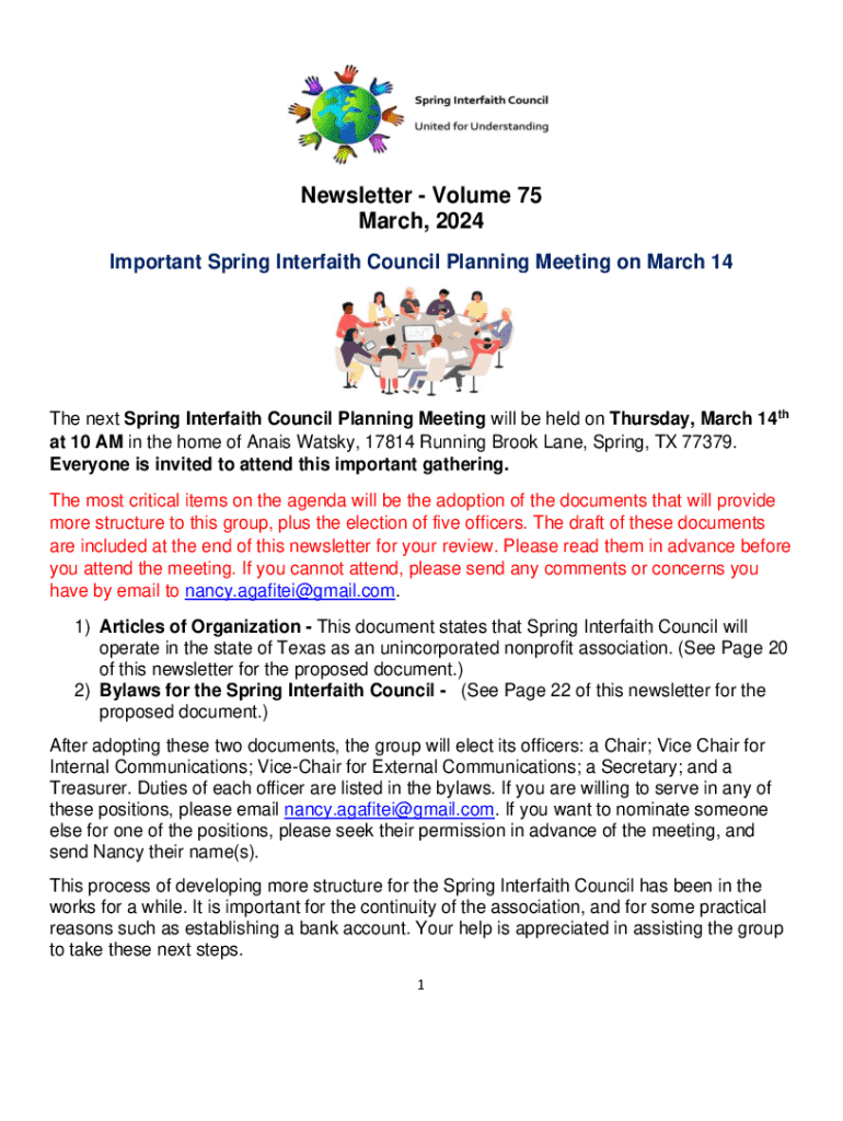 Newsletter Volume 75 March 2024 Important Spring Interfaith Council Planning Meeting on March 14The next Spring Interfaith Council Planning Meeting will be held on Thursday, March 14th at 10 AM in