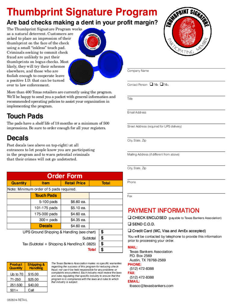 Reduce check fraud with the Thumbprint Signature Program. Learn how to implement this deterrent used by over 400 Texas retailers. Order your touch pads and decals today!