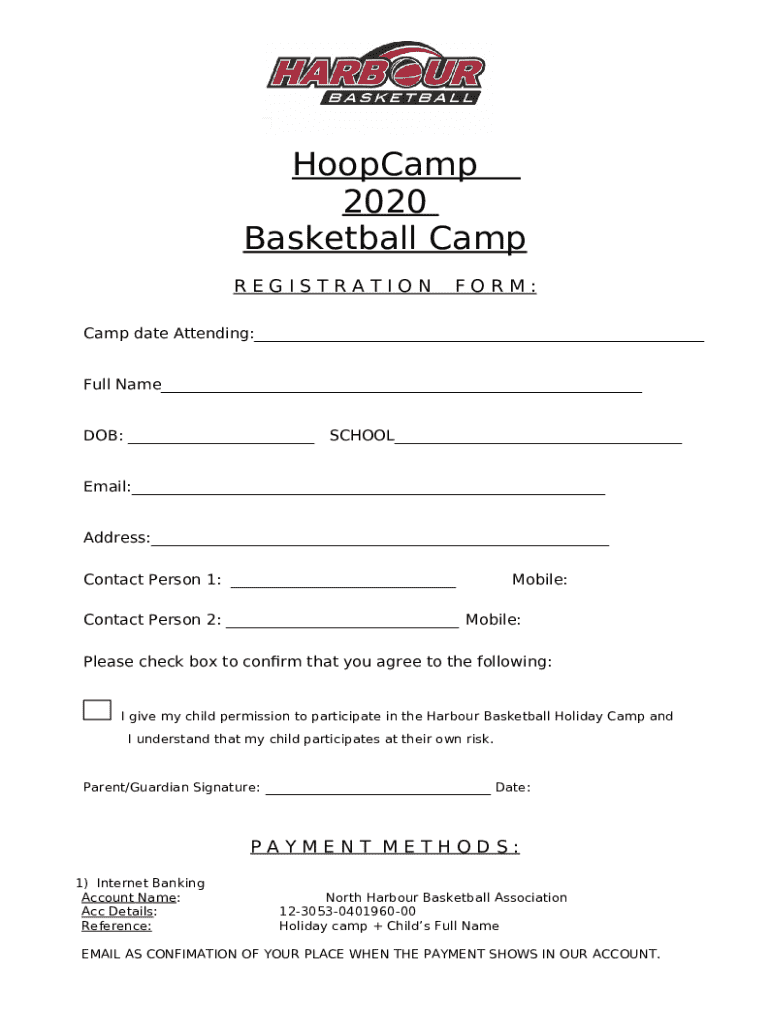 The Hoopcamp Registration is a Word document needed to be submitted to the specific address in order to provide some information. It must be filled-out and signed, which can be done manually in hard copy, or with a certain solution like PDFfiller. This tool lets you fill out any PDF or Word document directly in your browser, customize it depending on your needs and put a legally-binding e-signature. Right after completion, you can send the Hoopcamp Registration to the appropriate recipient, or multiple recipients via email or fax. The editable template is printable too due to PDFfiller feature and options proposed for printing out adjustment. Both in digital and physical appearance, your form should have a neat and professional appearance. You can also save it as the template to use later, so you don't need to create a new file over and over. All that needed is to customize the ready sample.