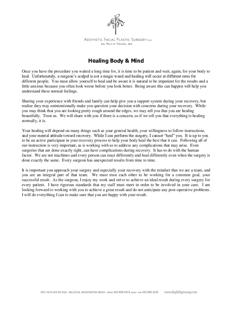 Healing Body & Mind Once you have the procedure you waited a long time for, it is time to be patient and wait, again, for your body to heal. Unfortunately, a surgeons scalpel is not a magic wand and