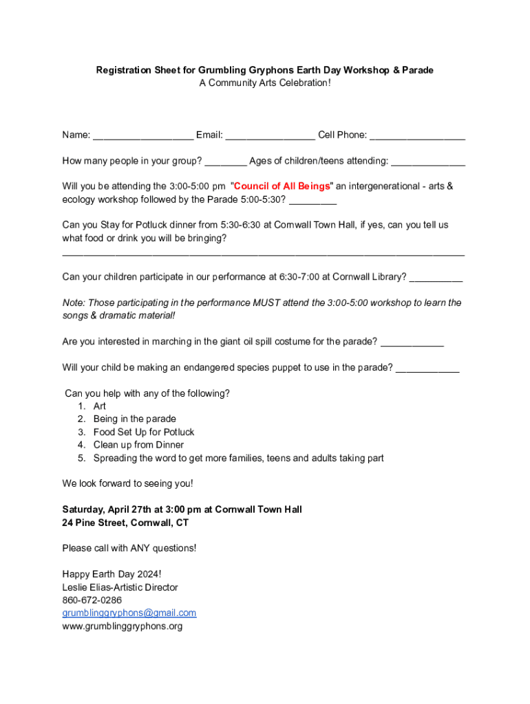 Get the free Registration Sheet for Grumbling Gryphons Earth Day Workshop & Parade