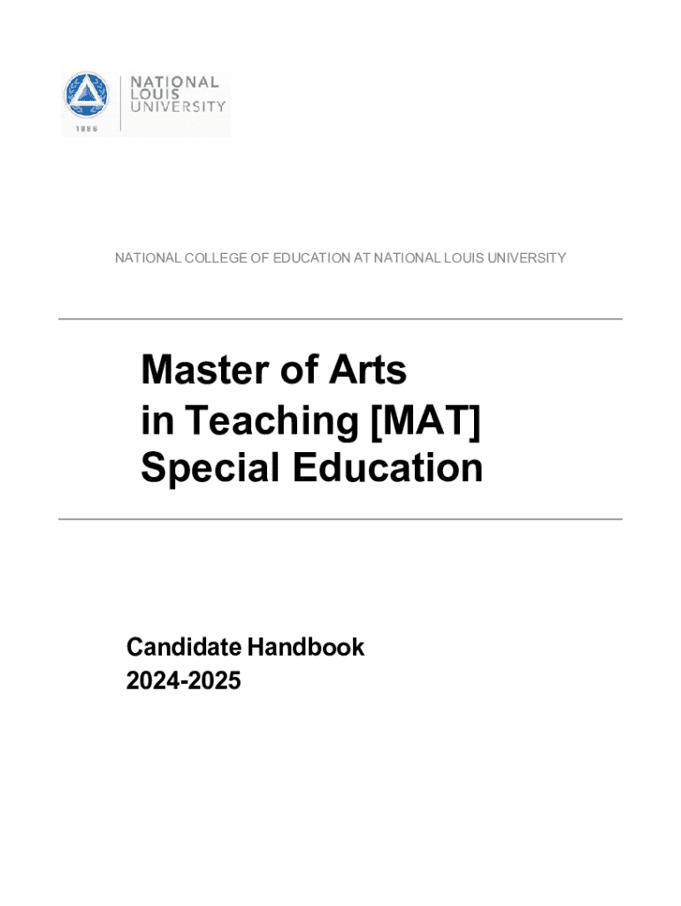 This handbook serves as a comprehensive guide for candidates pursuing the Master of Arts in Teaching in Special Education at NLU, outlining program requirements, expectations, and support for successful teacher training.