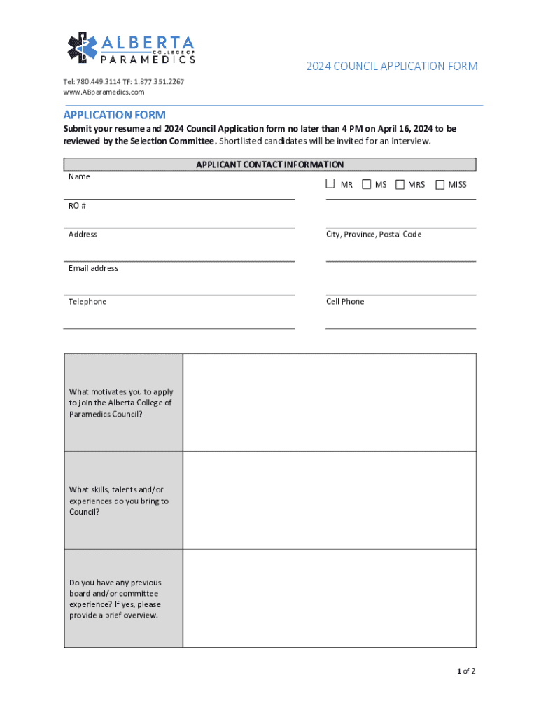 Apply for the 2024 Alberta College of Paramedics Council position. Submit your resume and application by April 16, 2024, for consideration.