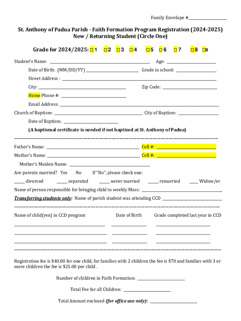 Register your child for the St. Anthony of Padua Parish Faith Formation Program for 2024-2025. Complete details including tuition fees and emergency contacts.