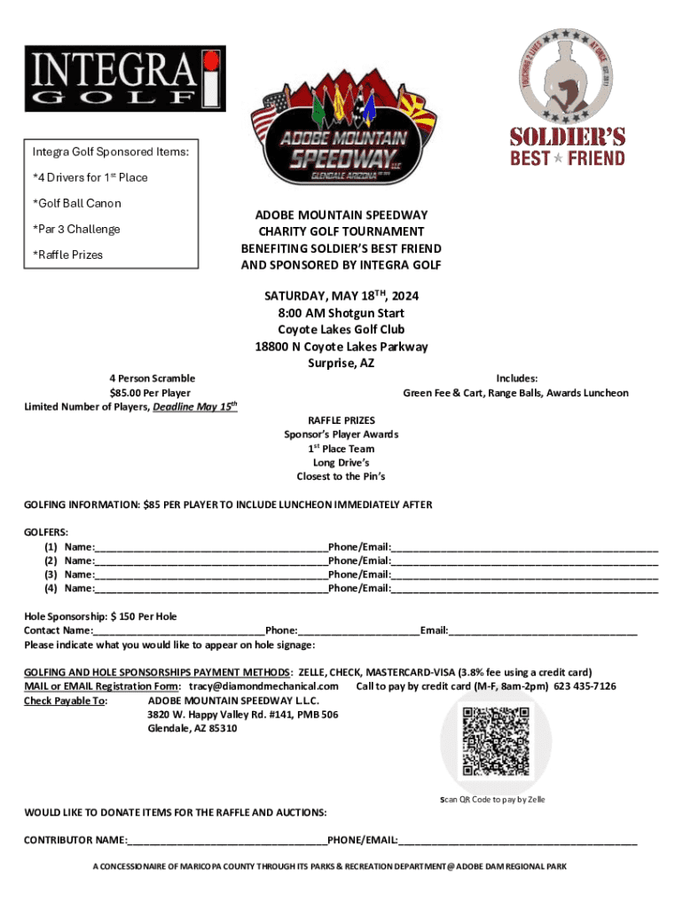 Join the Adobe Mountain Speedway Charity Golf Tournament on May 18th, 2024. Play a 4-person scramble for $85, benefiting Soldier’s Best Friend. Register now!
