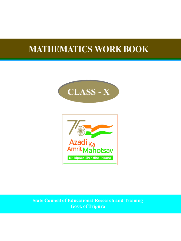 MATHEMATICS WORK BOOKCLASS XState Council of Educational Research and Training Govt. of Tripura All rights reserved by SCERT, TripuraMAHEMATICS WORK BOOK Class XFirst Edition September, 2021Cover Design Asoke Deb, TeacherType & Setting : SCERT, TripuraPrinted by : Satyajug Employees Cooperative Industrial Society Ltd. 13, Prafulla Sarkar Street, Kolkata72Publisher : State Council of Educational Research and Training Government of Tripural y ly sf# !y