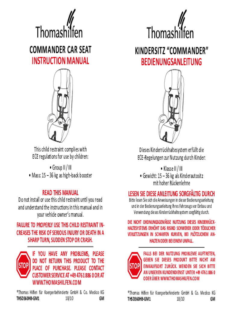 COMMANDER CAR SEAT INSTRUCTION MANUALKINDERSITZ COMMANDER BEDIENUNGSANLEITUNGThis child restraint complies with ECE regulations for use by children: Group II / III Mass: 15 36 kg as highback boosterDieses
