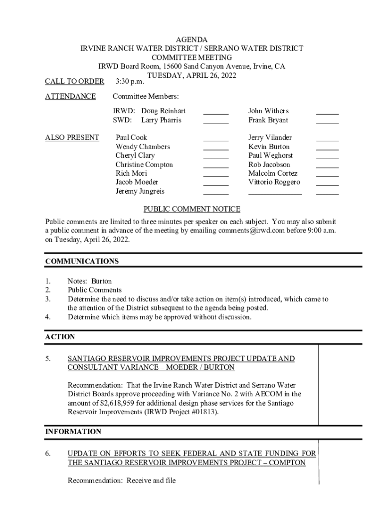 AGENDA IRVINE RANCH WATER DISTRICT / SERRANO WATER DISTRICT COMMITTEE MEETING IRWD Board Room, 15600 Sand Canyon Avenue, Irvine, CA TUESDAY, APRIL 26, 2022 CALL TO ORDER 3:30 p.m. ATTENDANCECommittee Members: IRWD: Doug Reinhart SWD: Larry PharrisALSO PRESENTPaul Cook Wendy Chambers Cheryl Clary Christine Compton Rich Mori Jacob Moeder Jeremy JungreisJohn Withers Frank Bryant Jerry Vilander Kevin Burton Paul Weghorst Rob Jacobson Malcolm Cortez Vittorio RoggeroPUBLIC COMMENT NOTICE Public