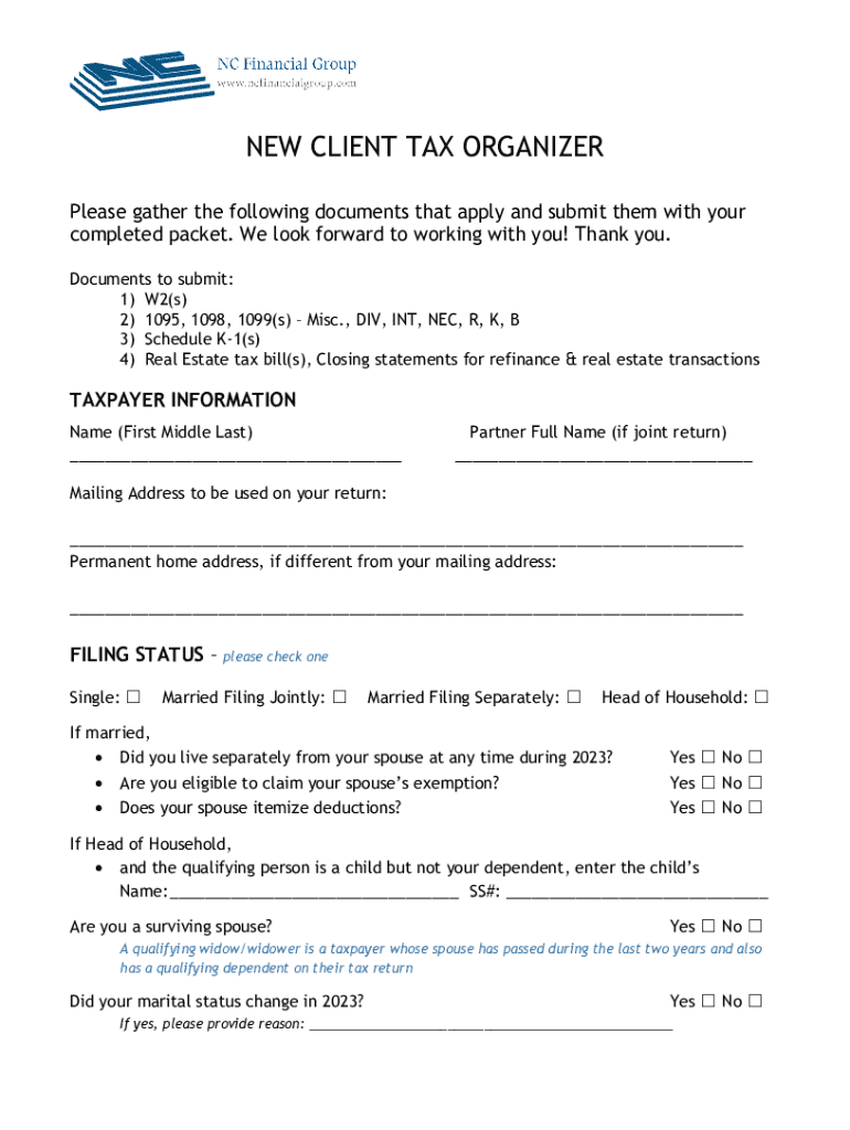 Complete your 2023 tax season efficiently with our New Client Tax Organizer. Gather essential documents to ensure a smooth tax return process.