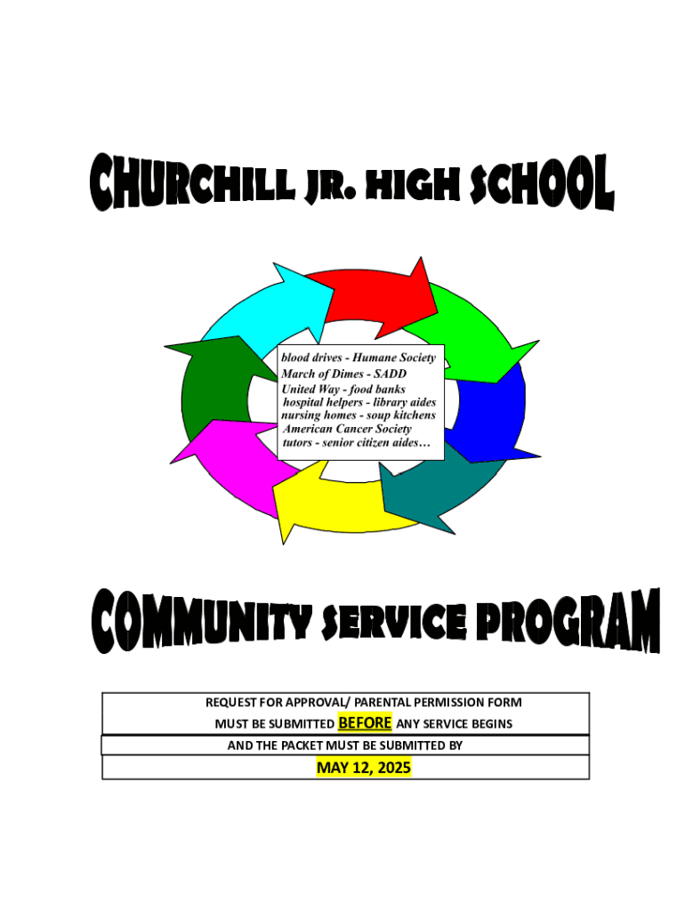 This form is for parents to grant permission for their children to participate in Churchill Jr. High School\'s Community Service Program and to ensure proper documentation before service begins.