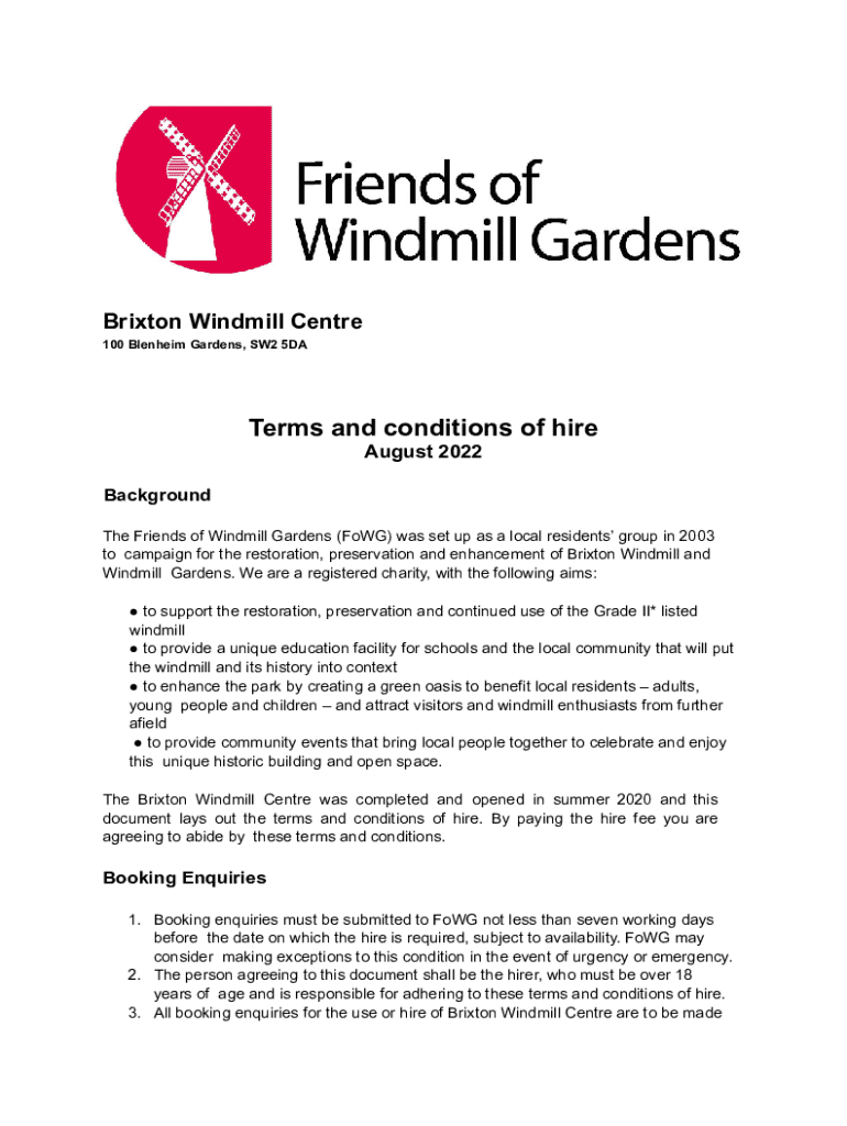 Individuals or organizations that wish to use the Brixton Windmill facilities or participate in its programs are required to file the Brixton Windmill Centre terms.