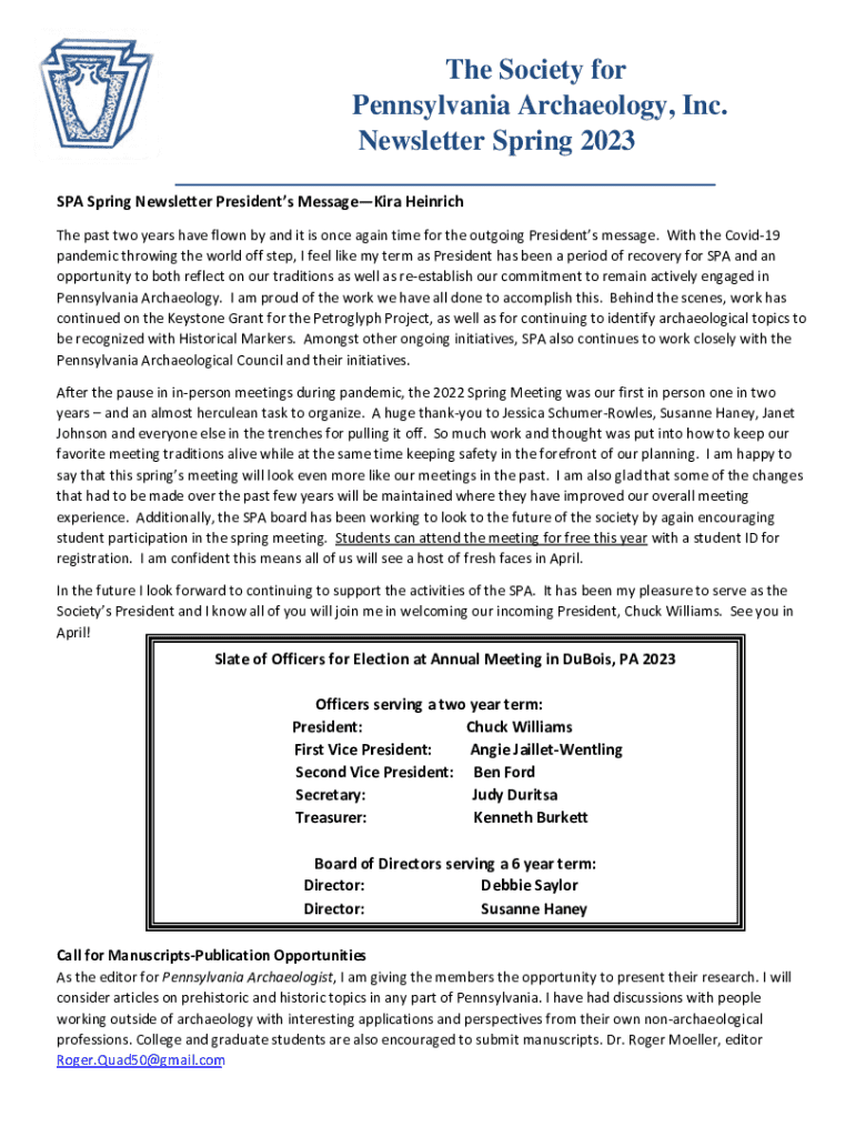 Explore the Spring 2023 newsletter from the Society for Pennsylvania Archaeology, featuring a president\'s message, annual meeting details, scholarships, and member opportunities.