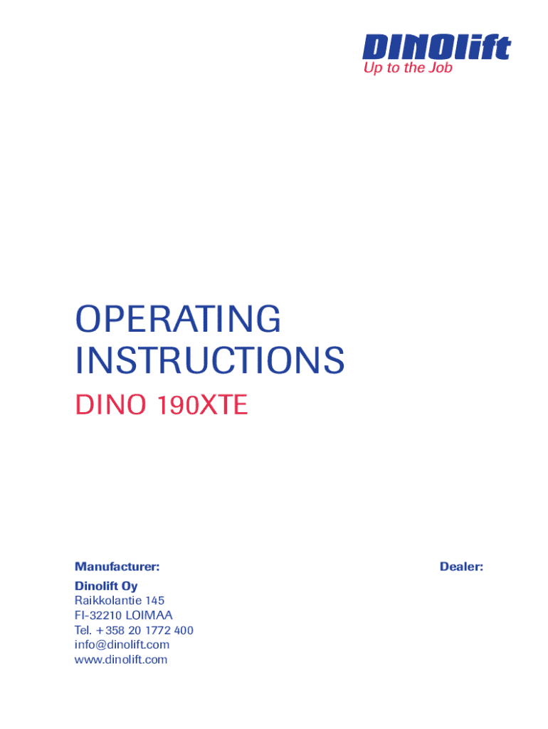 The operating instructions for the Dinolift DINO 190XTE are designed to facilitate ease of use while ensuring safety during operation. Operators should always start with a thorough pre-operation checklist to confirm the lift's readiness for work.