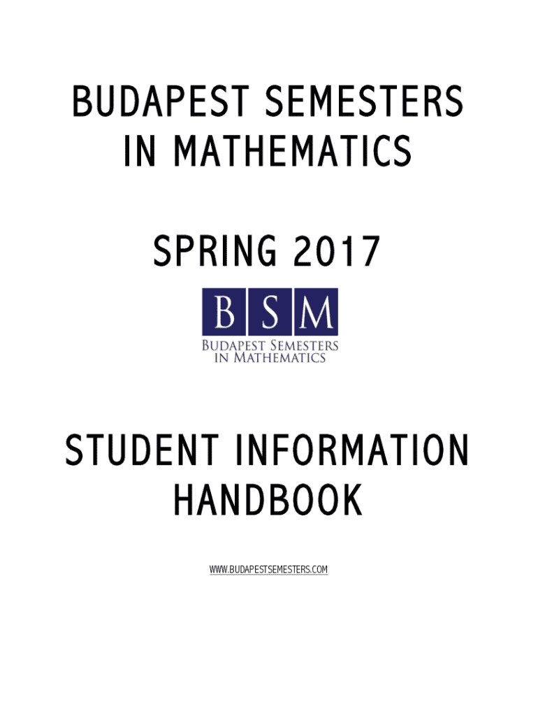 This handbook provides essential information for students accepted into the Budapest Semesters in Mathematics program, offering guidance on logistics, finances, and academic details for Spring 2017.
