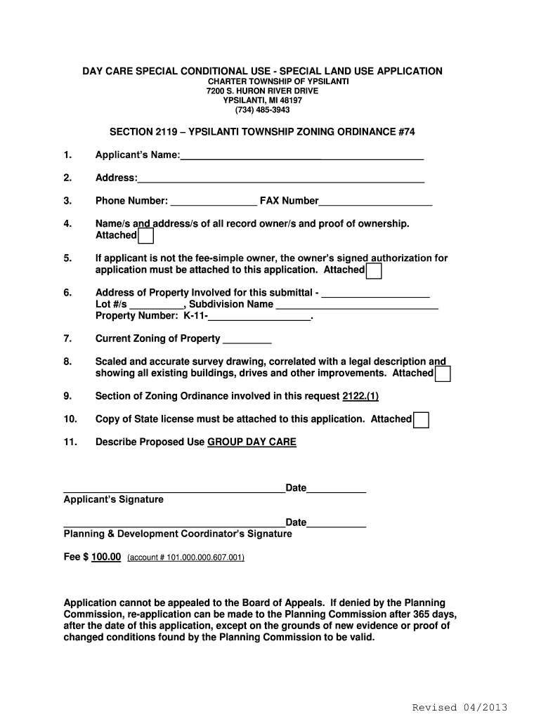 DAY CARE SPECIAL CONDITIONAL USE SPECIAL LAND USE APPLICATION CHARTER TOWNSHIP OF YPSILANTI 7200 S. HURON RIVER DRIVE YPSILANTI, MI 48197 (734) 485-3943 SECTION 2119 YPSILANTI TOWNSHIP ZONING ORDINANCE