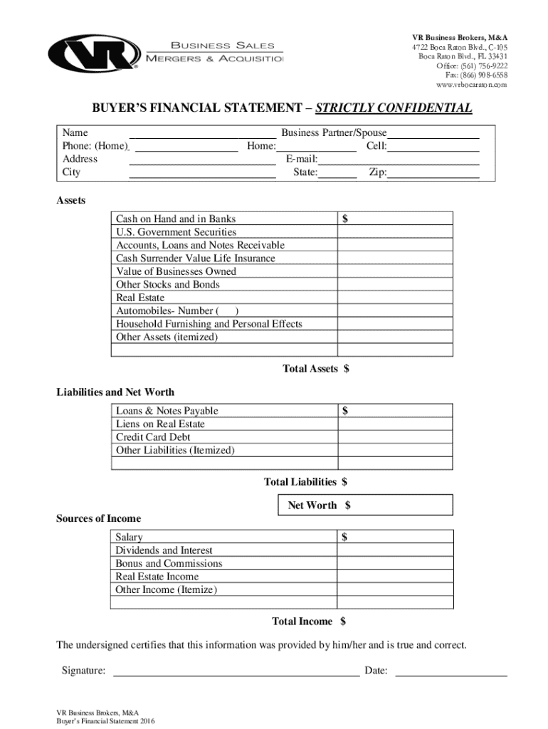 Complete this confidential buyer\'s financial statement to assess your financial standing for M&A transactions with VR Business Brokers. Accurate details ensure effective assistance.