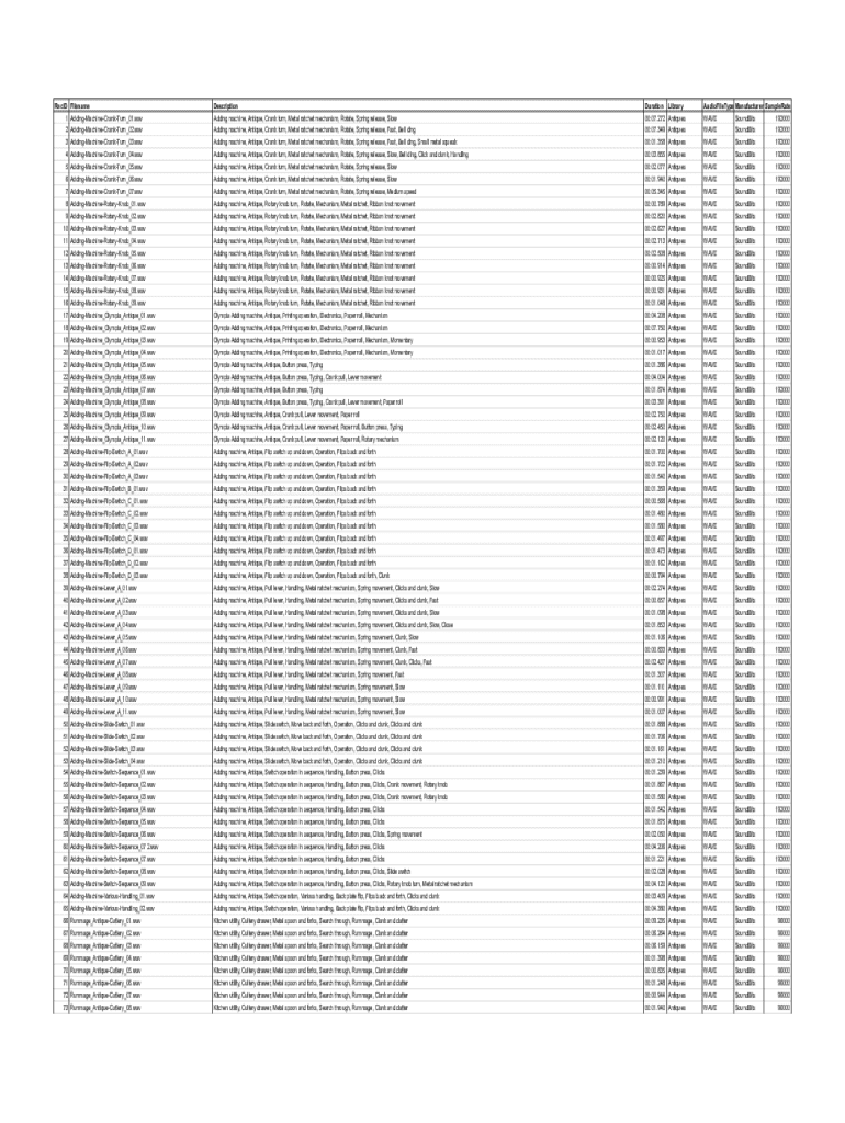 RecID FilenameLibraryAudioFileType Manufacturer SampleRateDescriptionDuration1 AddingMachineCrankTurn_01.wavAdding machine, Antique, Crank turn, Metal ratchet mechanism, Rotate, Spring release, Slow00:07.272 AntiquesWAVESoundBits1920002 AddingMachineCrankTurn_02.wavAdding machine, Antique, Crank turn, Metal ratchet mechanism, Rotate, Spring release, Fast, Bell ding00:07.349 AntiquesWAVESoundBits1920003 AddingMachineCrankTurn_03.wavAdding machine, Antique,