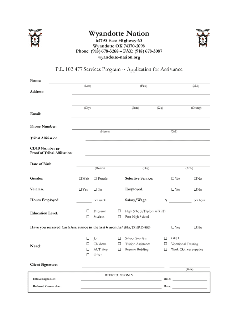Apply for assistance through the Wyandotte Nation P.L. 102-477 Services Program. Complete the application for cash and support services in 2023.
