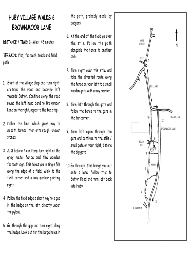 HUB VILLAGE WALKS 6BROWNMOOR LANE DISTANCE / TIME: 1 Miles : 45 minutes.TERRAIN: Flat, footpath, track and field path.1. Start at the village shop and turn right, crossing the road and bearing left