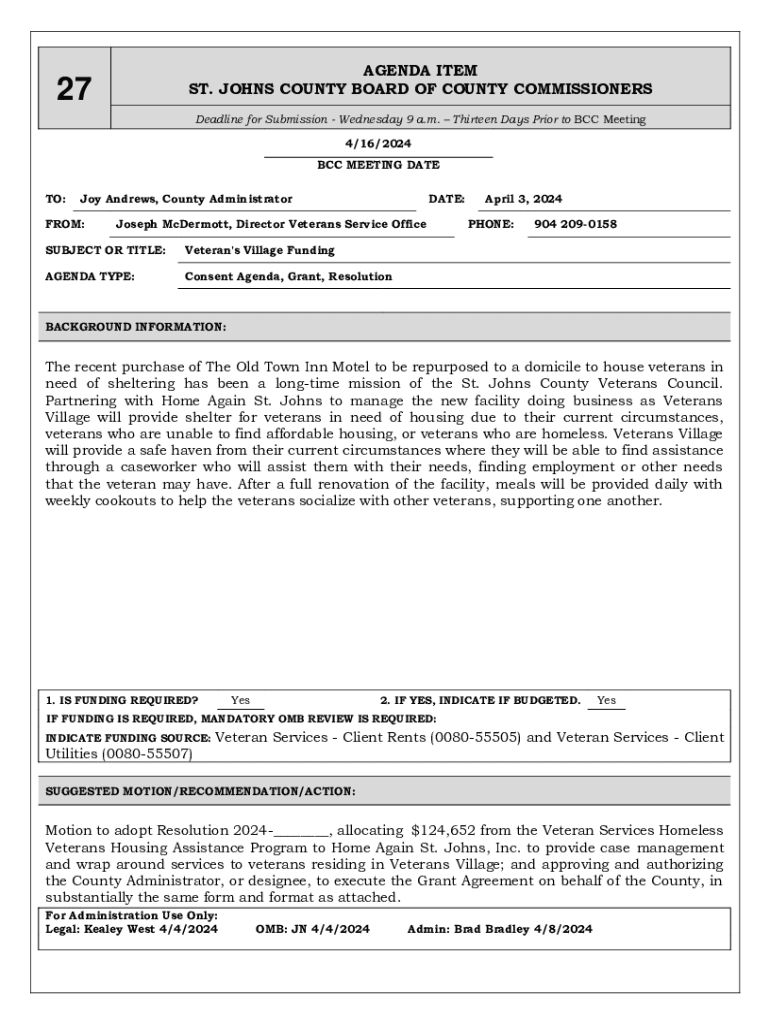 AGENDA ITEM ST. JOHNS COUNTY BOARD OF COUNTY COMMISSIONERS27Deadline for Submission Wednesday 9 a.m. Thirteen Days Prior to BCC Meeting 4/16/2024 BCC MEETING DATE TO:Joy Andrews, County AdministratorFROM:DATE:Joseph
