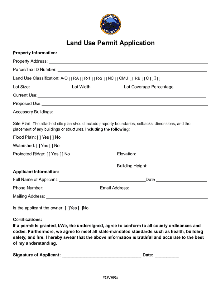 Complete the Land Use Permit Application for Madison County, ensuring compliance with local ordinances and health standards for property development.