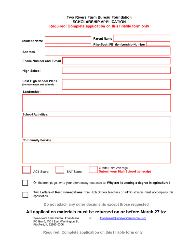 Two Rivers Farm Bureau Foundation Scholarships The Two Rivers Farm Bureau Foundation is offering five $1,000 scholarships to qualifying students graduating from high schools in Pike and Scott counties