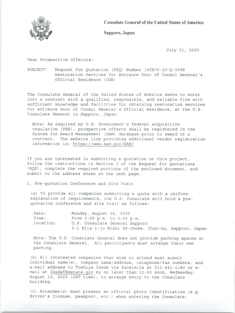 Consulate General of the United States of AmericaSapporo, JapanJuly 31, 2020Dear Prospective Offerers: SUBJECT:Request for Quotation (RFQ) Number 19JA7020Q0098 Restoration Services for Entrance Door